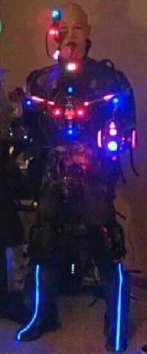 Máscara de locutus con agregado LED, robótica, fuentes de alimentación (3 bancos de energía con 36.000 mAh de potencia!! Es el tamaño de cerca de 20 baterías smartphone)!!!!!! 9 voltios, AA, AAA, baterías, cilindros que atraen a su dedo y tiene, cambiador de voz con 15 diferentes voces, amplificador de sonido y altavoces, arma que cuenta con 12 diferentes patrones de disparos pistola ciencia ficción efectos de sonido que se envía al altavoz principal de doble sonido amplificado, Cables USB hackeó para energía, cables + muchas toneladas de pegamento caliente, hierro de la soldadura y la soldadura de Plasma Real ver , super pegamento, tuercas y pernos, cientos de luces LED y pasó por una gran cantidad de tijeras y cuchillas para tallar piezas de los envases plásticos como botellas de jugo V8, botellas de jugo de naranja Tropicana, botellas de detergente de lavandería, empuje las luces, unos $50 valor de negro conducto del alambre del PVC de la tubería, tubería de aire claro, etc..