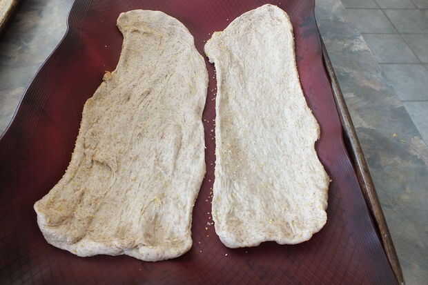 Estire cada mitad de masa a la longitud de un 14" hoja bandeja para hornear.