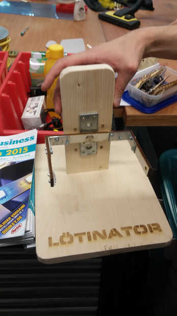 Verifique si el eje se ajusta a través de - si no, ajuste el agujero así que usted puede dar vuelta sin mucha fuerza. Tenga cuidado de no hacerla demasiado grande! Ahora, perforar el mismo agujero a través una placa de metal y montarlo en la parte superior del orificio en el poste de madera, por lo que el eje pasa por ambos. Fijar el metal sobre la madera con tornillos como se muestra en la imagen.