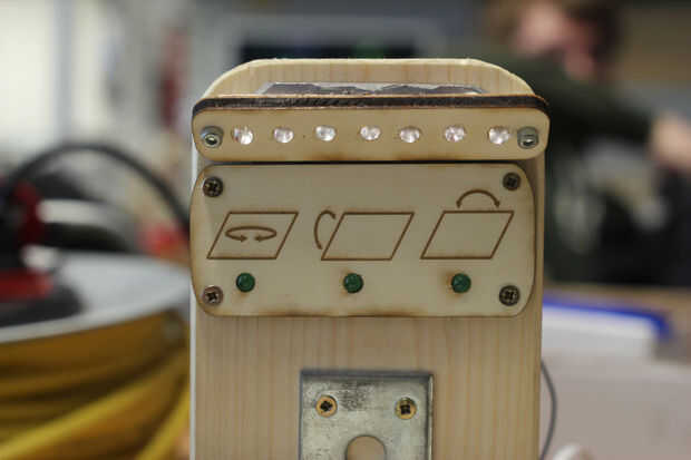 Después de que el motor se fija en el post principal, añadimos algo de luz! Este no es un paso necesario, pero lo hace todo mejor apariencia. Añadir dos cosas: una barra de luz con 7 LEDs blancos para iluminar la placa de trabajo y un bar con 3 LEDs y signos para mostrar el actual eje giratorio.
