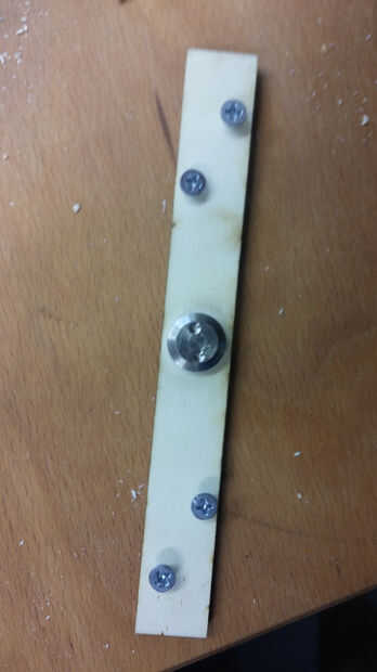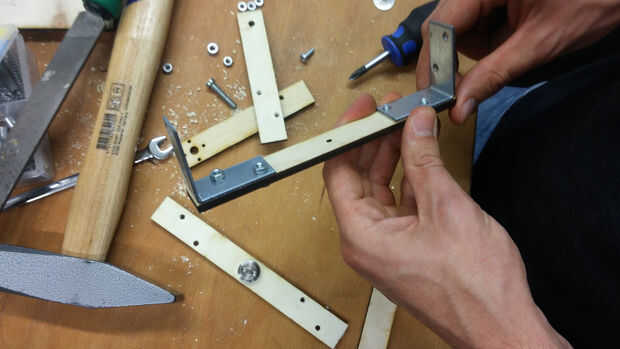 El siguiente paso es un soporte madera formado de "U", que tiene que girar el plano de trabajo, un plato redondo y otra placa con dos servos conectados. Por lo tanto la "U" tiene que ser sólida, pero también pequeñas y no pesado. Sólo tienes que recortar las tres piezas (hemos utilizado una madera maciza 5mm) y ponerlos juntos (ver archivos: hinten.svg; rechts.svg; links.svg). Necesita dos abrazaderas (metales) y unos tornillos para la construcción de la "U". Es la más pequeña pieza de madera en la parte de atrás, el uno con el agujero es el correcto y el agujero tiene que estar en el lado externo de la "U".