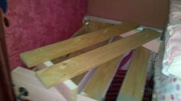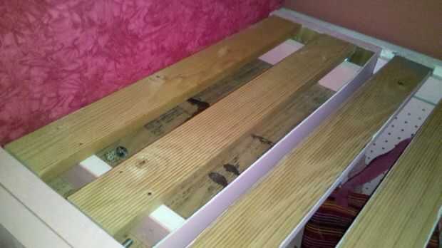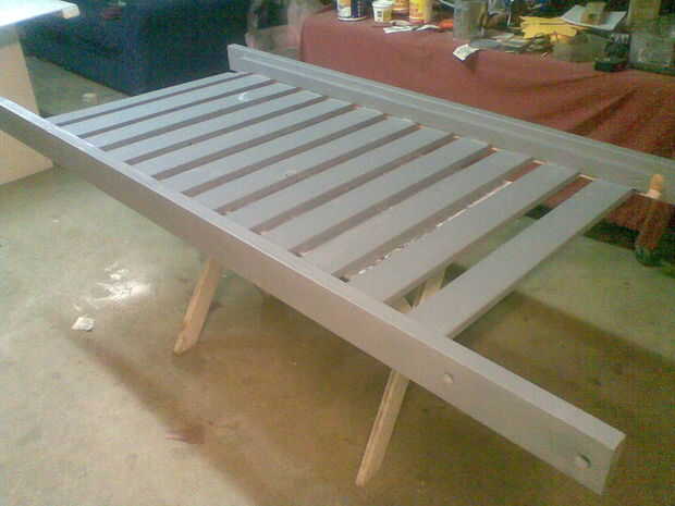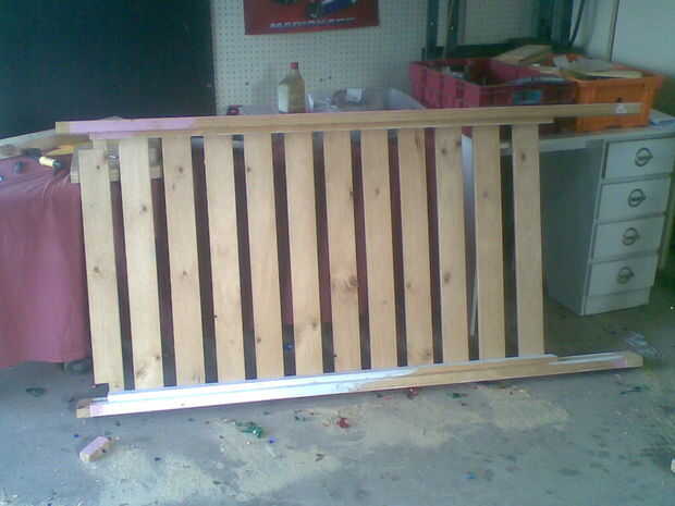 La estructura base está hecha de 2 largueros de pino de 90 x 35, con 42 x 19 soportes a lo largo de la parte interior de cada longitud. tablones de pino de 90 x 19 se corte, pegados y clavados entre los largueros. en la cabecera, se dejaron las tablas e hice una inserción pequeña para caber dentro de la parte superior de la estantería, para facilitar el montaje.