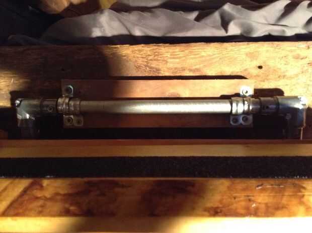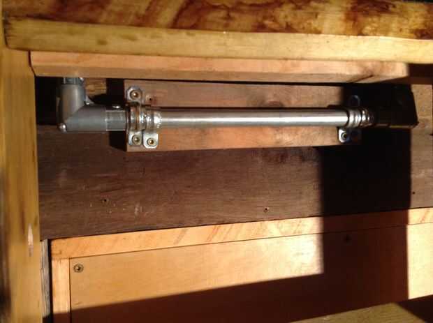 Observe que el rectángulo de conducto se atornilla a los bloques de madera. Los bloques son más cortos que el rectángulo de conducto para limpiar los codos de 90 grados. Esto le permite girar libremente.