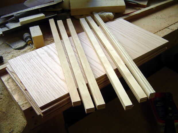 Cortar seis piezas de madera contrachapada de 1/4 a 250 x 486 mm y algunos de la buenos 5/8" madera contrachapada cortar seis tiras 20 x 486 mm. relleno todos los agujeros y las imperfecciones de la madera con masilla para madera y arena. Listo montar los marcos.