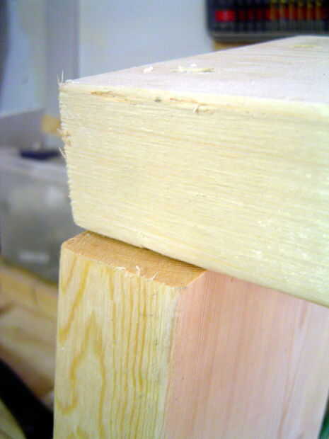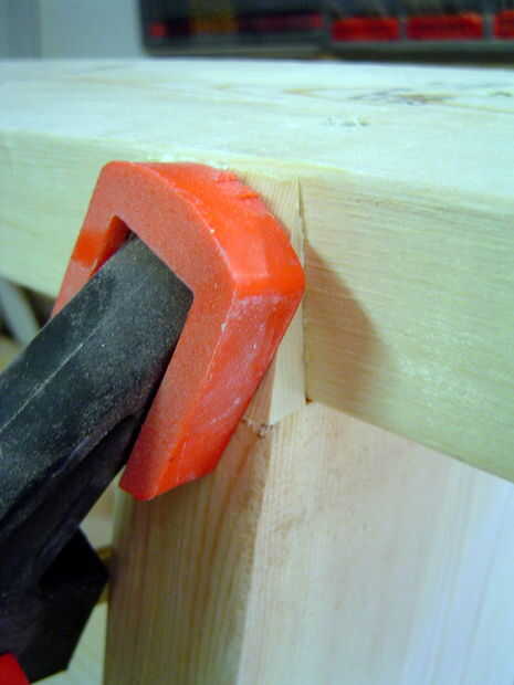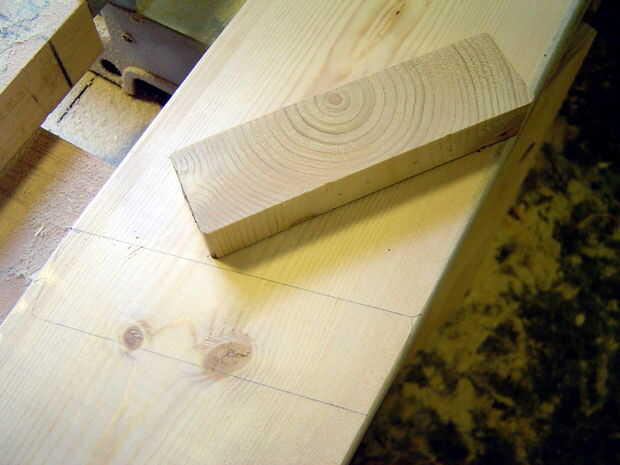 Hacer cortes (utilizando jigsaw o sierra + cincel) para el marco de 2 x 4 en la parte posterior de 2 x 6, 55 mm de profundidad en su punto más profundo, en la parte inferior del escalón superior.