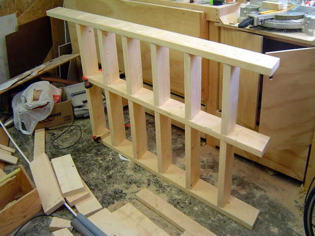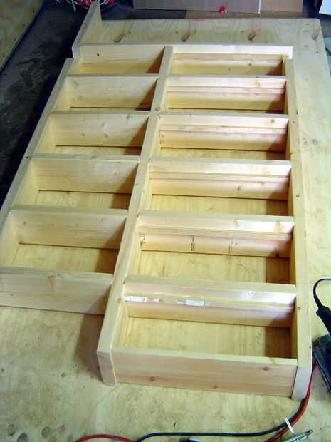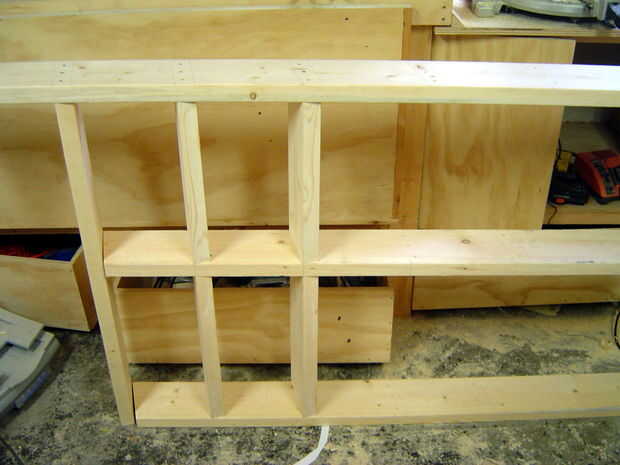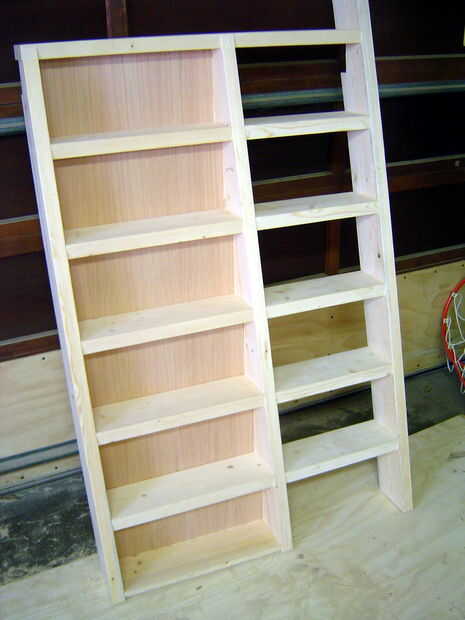 Añadir las tiras de madera contrachapada de 5/8" en la parte inferior de las piezas de 486 mm largo así que usted puede apoyar las espaldas de las estanterías; 55 mm de la parte posterior de cada estante. Fijar con pegamento para madera y brad clavador. Las partes posterioras de los estantes están hechas de madera contrachapada de 1/4" y pueden ser fijo en su lugar, clavado en la parte posterior de cada 2 x 6 y en la tira de contrachapado de frente.
