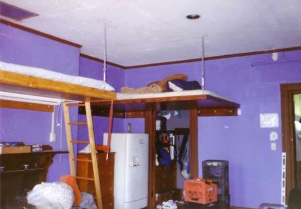 Los otros lofts en la habitación estaban los dos desvanes libre-que cuelga, que hace pivotar, construidos por manivela, Tweety y tiene, que se negó a dormir en cualquiera de ellos, alegando que él consiguió mareado. Son 3/4 hojas gruesas de madera con estructura grande abajo, colgado de cadenas. Aunque bastante prolijo, que fue construido cerca 21 demasiado cerca de la pared, dando lugar a temblores sísmicos en ambas habitaciones proporcionales a la actividad del loft-ocupante, por el loft que pega en la pared ligeramente construido. Pooter, por ejemplo, fue particularmente perturbado cuando éste golpeó algo fuera de su plataforma o su Holst: los planetas CD skip. También, pared-golpes de Batman (por así decirlo) era particularmente desagradable en 0600 el lunes, cuando tuvo que levantarse para cosas de ROTC.