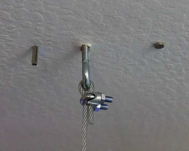 La primera versión tenía 3" ganchos y cable recubierto de 3/8" para sostener el borde suspendido de la estructura. Cuando estos ya no eran necesarias en la generación siguiente, los reemplacé con 2" ganchos y cable de 1/4" recubiertas para cortinas que rodean la cama y bloquear la luz y el sonido. Es increíble cuánto mejor duermo con el dibujado de cierre de cortinas.