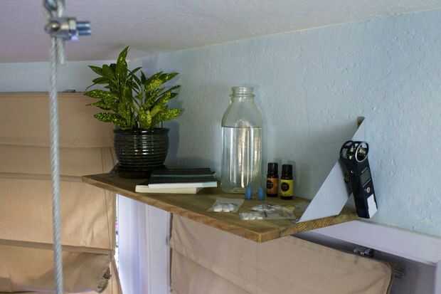 Un sistema de cortina de drenaje proporciona una sensación de privacidad y también transforma su loft en una cueva oscura y silenciosa para siestas durante el día de la alimentación y la hibernación a largo plazo. Un estante al lado de la cabecera de la cama tiene agua, libros, Advil y oler aromas para ayudar a dormir y despertar. Un Zoom grabador digital se lleva a cabo al lado de imán y me permite realizar mis sueños en medio de la noche. Resulta que borrachera-viendo Breaking Bad me hace soñar con la DEA rompiendo la puerta de mi laboratorio de metanfetamina tipo loft.