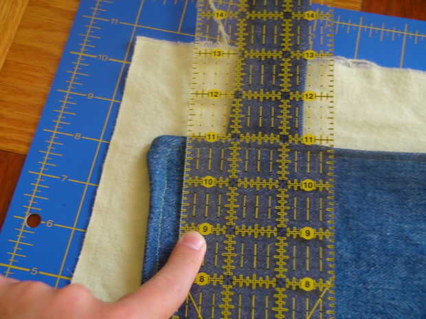 Medir la anchura y la longitud de la pieza principal para que usted sepa cuánto puede su bolsillo. Tomar la tela del bolsillo y medida y corte la longitud deseada y ancho. Mi bolsillo se va a celebrar una serie de cosas por lo que el mío es un bolsillo grande. Centro de la tela del bolsillo en la pieza principal y fije con un zig-zag puntada de costura sólo tres lados, dejando abierta la parte superior del bolsillo.