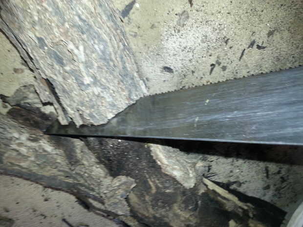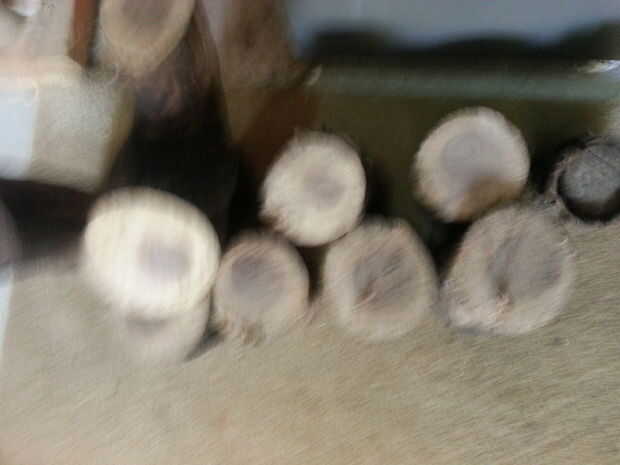 Cuando haya encontrado un registro del tamaño que más te guste, tome su mano y empezar a cortar. Trocear 5 pulgadas con su Serrucho. Usted puede marcar el corte para asegurarse de que usted tiene una línea recta para hacer un corte recto. Después tienes corte, tomar sus pedacitos de taladro y 3/8 de pulgada y empezar a perforar los agujeros para las plumas. Deje un pequeño espacio entre las perforaciones. Perforar hacia abajo aproximadamente 2 pulgadas (dar o tomar).