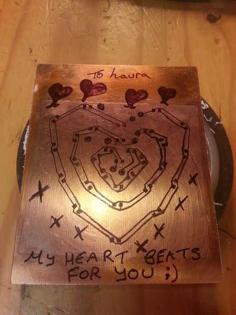 Como se puede ver en las fotos, dejó un mensaje agradable para el receptor. Originalmente usé un marcador de punta de cincel, pero esto comenzó a agotarse cuando se hace el corazón. Al final, esto funcionó para el mejor cuando me fount en parte les grabó al agua fuerte y le dio un poco de una mirada fresca :)