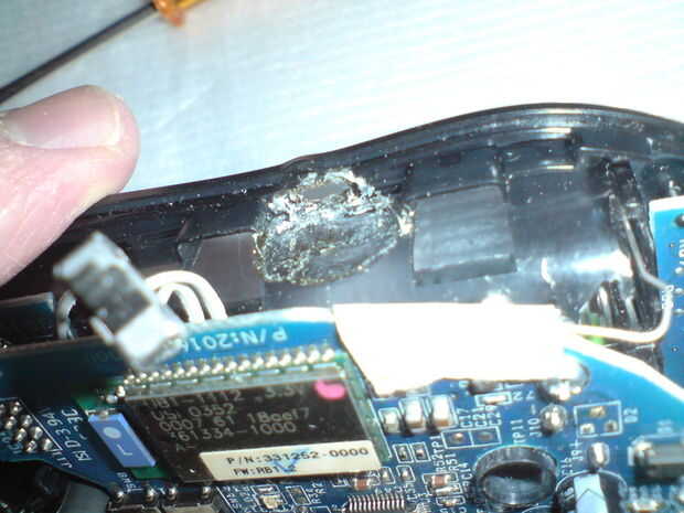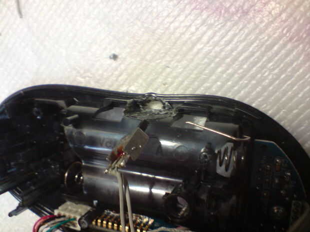Para hacer el agujero para el interruptor tuve que derretir a través de la planta del pie del ratón con mi hierro de soldadura como no tengo ninguna herramienta costosa astuta pero se puede hacer uso si tu suerte de poseerlas.