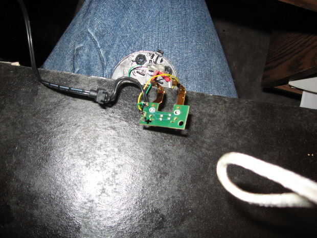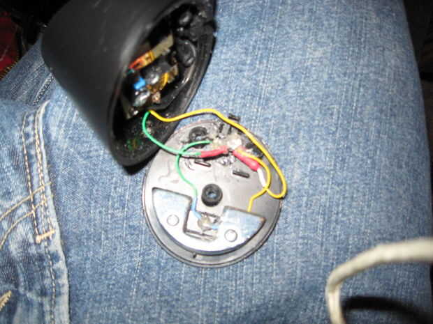 En la cubierta inferior, hay algunos pesos de plata. un taladro (uso un poco con el diámetro del led) en medio de los pesos y luego perfore otro en el centro de los dos orificios del tornillo trasero.