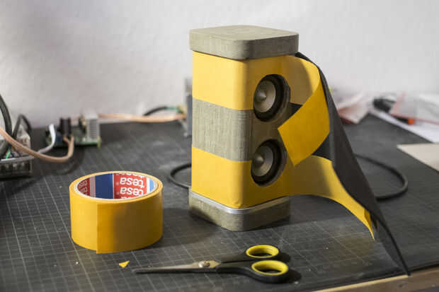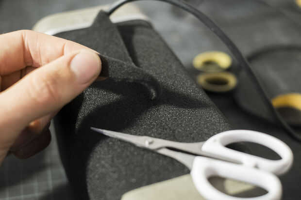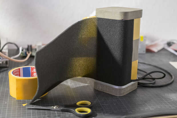 Después de cortar un trozo de espuma con la dimensión correcta de la altura pero unos milímetros más ancho, usé Kapton cinta para sostener la espuma en su lugar. A partir de la parte posterior del altavoz hacia Ronda y finalmente corte de la espuma excesiva para obtener una costura bonita.