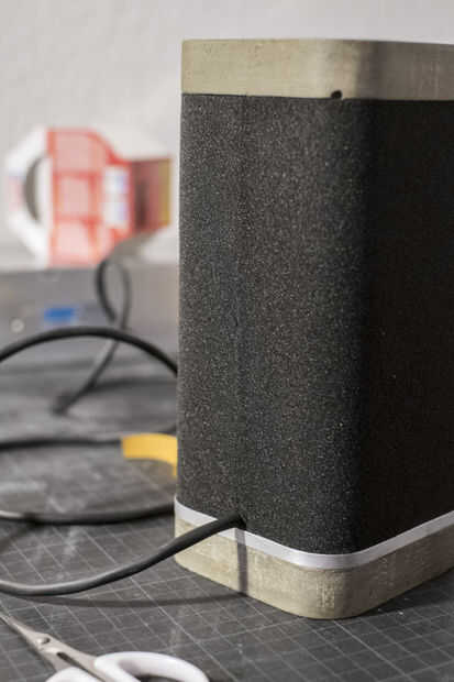 Para el altavoz que he usado espuma de poliéster negro espesor 3mm. Ya que yo quería que fuera muy lisa y suave al tacto que opté por un 80ppi espuma (poros por pulgada). También es importante usar espuma con poros abiertos como son utilizados en aplicaciones de filtración. Esto permitirá que el sonido pase a través de la espuma con distracciones mínimas.