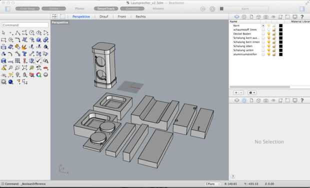 Primero modeló las bocinas con cada detalle totalmente en Rhino y tomó algunos renders para visualizar mis intenciones. Para el modelado es muy importante que sus nuevos recintos tienen el mismo volumen que los originales de los altavoces de sonido y funciona correctamente. Así que desmontar las carcasas originales, había eliminado los controladores y llenan las cajas de agua para determinar el volumen que necesario para los nuevos. Simplemente medir el volumen de agua que cabe en allí y listo, también se puede utilizar arena por cierto.