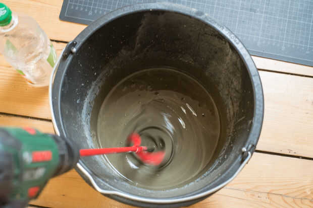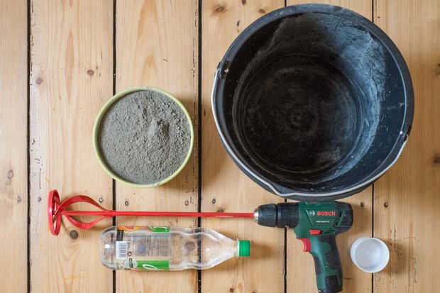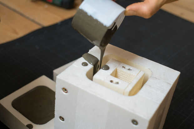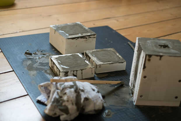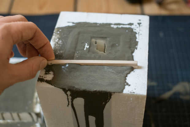El siguiente paso fue mezclar el concreto a una textura líquida y verter en los moldes. Tapping en los moldes ayuda a obtener la mayoría de las burbujas hacia fuera. Aplanó las superficies utilizando un palo para limpiar el concreto excesiva en la parte superior.