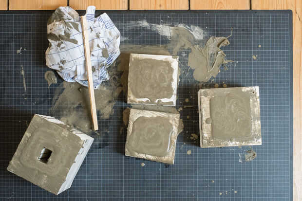 Después los moldes se vierten, atención se debe a no dejar que el hormigón seco hacia fuera puesto que necesita el agua para el endurecimiento adecuado. Cubre los moldes con un paño húmedo y me dejó la curación concreta durante 2 días antes de empezar a demold.