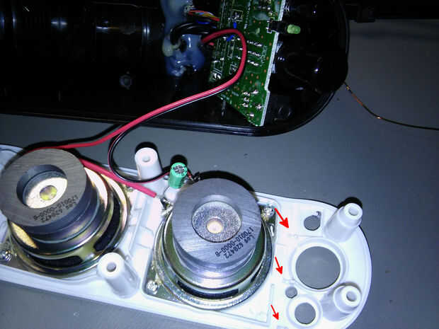 Con cuidado, volver a montar el altavoz. Tenga en cuenta que el circuito tiene que introducirse en las muescas en la parte posterior y en la parte delantera.