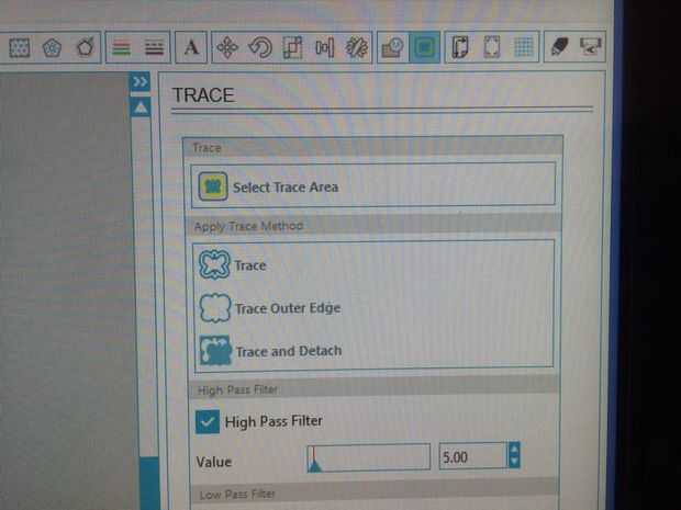 En el lado derecho del software de estudio de la silueta hay muchos botones de referencia rápida. Seleccione el botón que se parece a una mariposa para acceder al menú de seguimiento. Haga clic en la sección "Seleccionar área de rastro" y resaltar la zona deseada para cortar. En nuestro caso queríamos que todos los de la cara del robot a cortar lo seleccionado toda la imagen. También debe seleccionar un método de seguimiento para su imagen. Hemos optado por trazar la imagen entera. Asegúrese de jugar con el filtrado de paso alto/bajo y las opciones de umbral, si su resultado no es lo que usted quería.