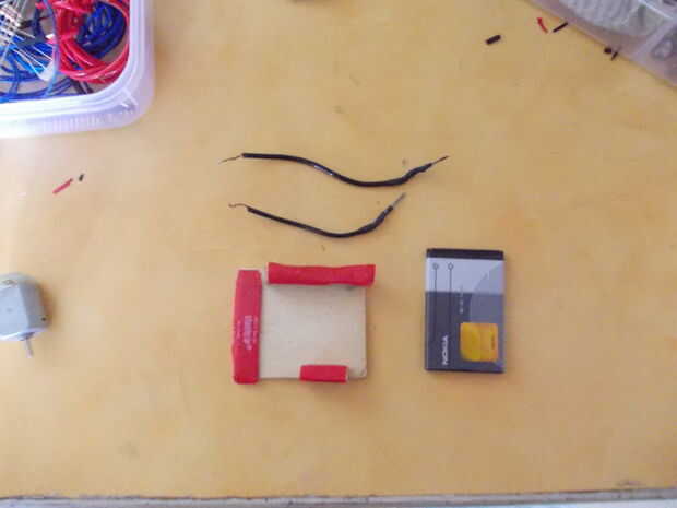 Los 2 motores DC, diapositiva on y la batería de 9 voltios es fijarse en la parte superior. Cinta de doble cara es muy conveniente ya que uso es rápido y da buena suspesion así! Por lo tanto se utiliza para proteger los motores y el interruptor. Mi conmutador es un 2 canales, puede utilizarse para conectar dos pares de cables. La batería de 9 voltios sin embargo de alguna manera permanece en su lugar.