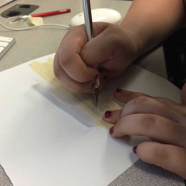 6. Utilice el cuchillo del exacto para trazar las líneas de su diseño. Aplique una fuerza suficiente para cortar a través de la cinta pero no lo suficiente para cortar a través del papel. Cuarta ver foto.