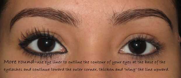 Usar delineador de ojos para delinear el contorno de los ojos en la base de las pestañas y seguir hacia la esquina externa, espesa y 'ala' la línea hacia arriba.