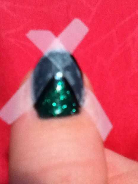 Si no lo has hecho ya, corte la misma cinta de tamaño para todas las uñas en una mano otra vez. A continuación, aplique la cinta paralela a los lados del triángulo verde. Deje mucho espacio para una amplia banda de oro o un poco por una banda más pequeña. Recuerde que esta será la parte más difícil porque lo estás haciendo a mano alzada contra el verde.