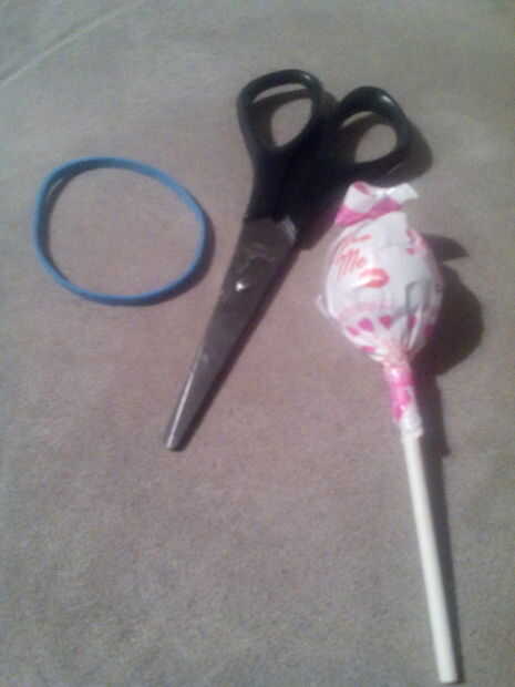 Haz un par de tijeras, una piruleta y un pedazo de papel. (No necesita una banda elástica)