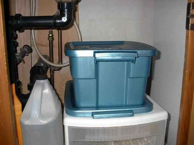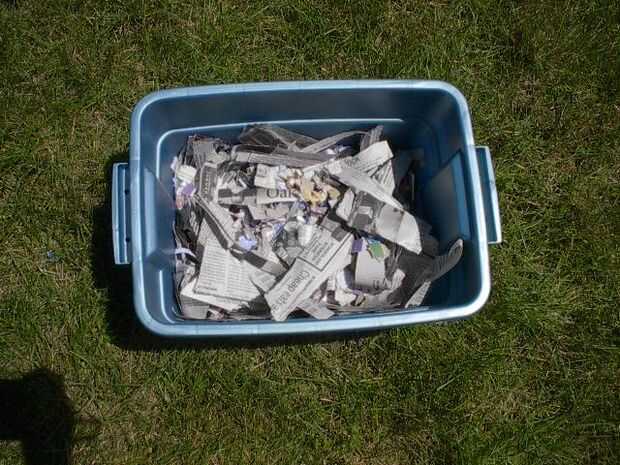 Poner algún papel picado en el fondo del recipiente y su depósito está ahora listo para usar! Mantener un recipiente vacío (con el papel en la parte inferior de la misma) debajo del fregadero de la cocina. Cuando está llena, añado una capa de papel y un poco de suciedad y mover al sótano. También guardo una de las tapas de repuesto bajo el recipiente en la cocina para coger todo lo que puede deslizarse a través de los agujeros. Si su recipiente comienza a oler, añadir más papel. Periódico es muy bueno para absorber los olores.