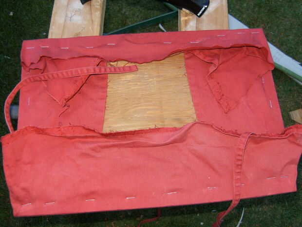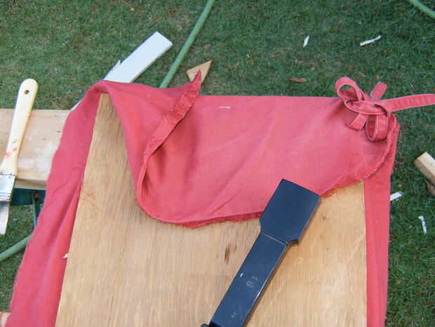 Dale la vuelta y tire de la tela de derecho y la primera se grapa en el centro. Luego ir desde el centro hacia fuera, haciendo que se estire a la tela cada vez antes de la grapa.
