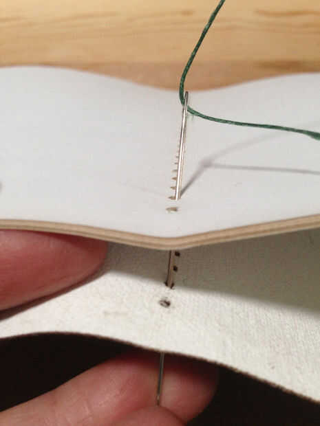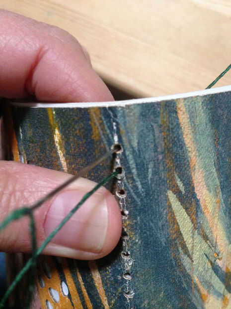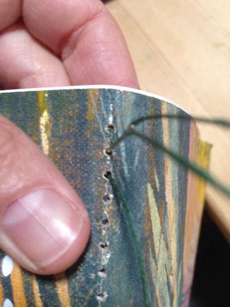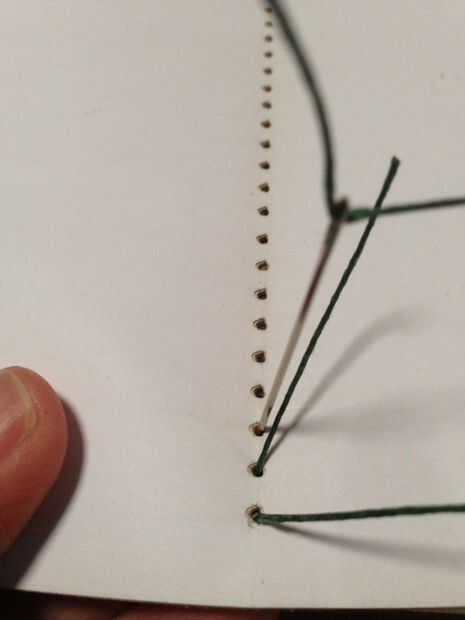 Volver hacia el interior a través del segundo agujero, creando una segunda puntada en el lomo (fotos 7 y 8).