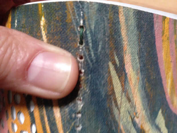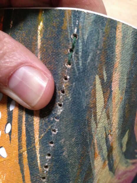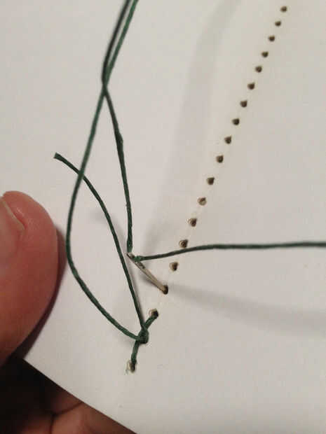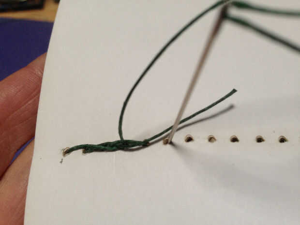 A partir de un extremo de la fila de agujeros, comienza a coser por entrar en el segundo agujero del extremo, viajando desde el interior hacia el exterior del libro (Foto 1). Tire del hilo a través de todo el camino hacia el exterior, dejando una pulgada de hilo en el interior.
