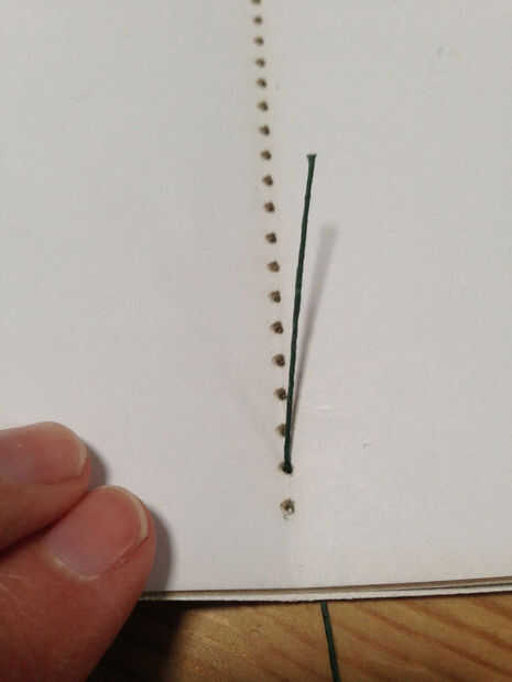 Ahora estás en el primer agujero en el interior del libro. Coser en el tercer agujero, cogiendo la cola en el camino hacia abajo (continuar a hacer esto cuando se cose en el interior, hasta que te quedas sin cola). Tire del hilo firmemente hacia el exterior y apriete el hilo hacia abajo sobre la cola en el interior (fotos 5 y 6).