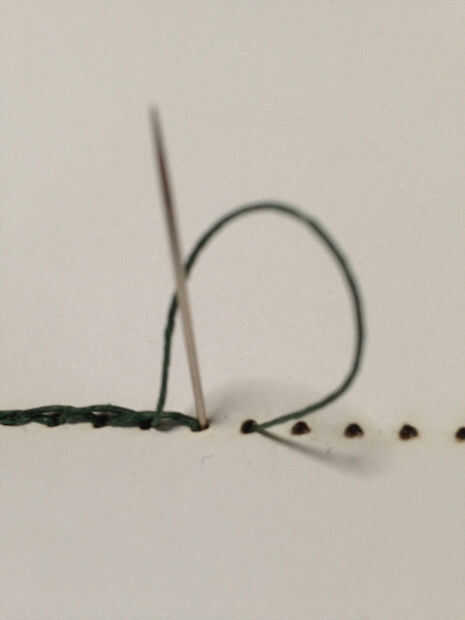 Omitir el siguiente agujero por dentro y bajar por el cuarto agujero (coger la cola - Foto 9) y volver desde el exterior, a través del tercer orificio. Bajar por el quinto agujero y volver a través del agujero cuarto y así sucesivamente. Apriete el hilo en ambos lados mientras trabaja su manera a lo largo de la columna vertebral como este hasta llegar al último agujero en el exterior. Volver a interior en el segundo agujero.