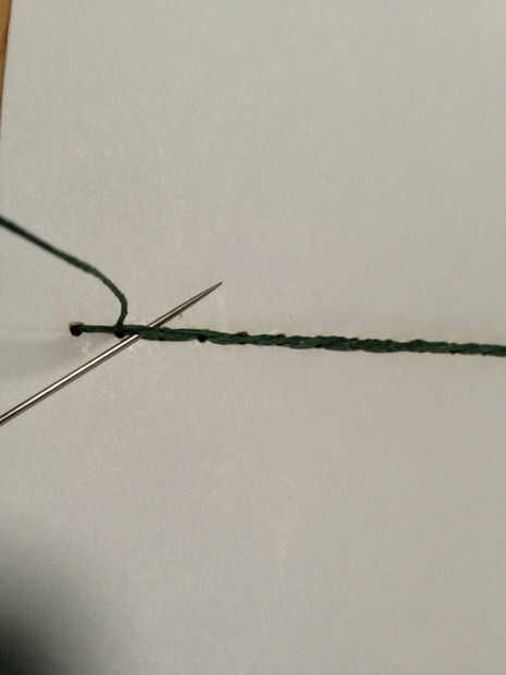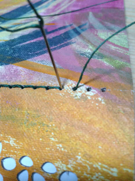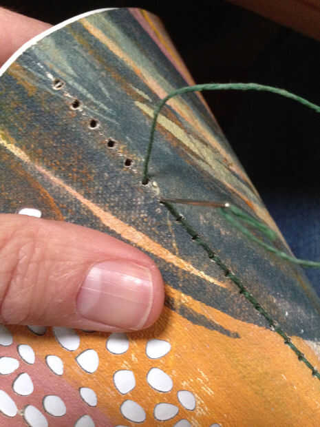 Una vez que esté en el segundo al último agujero en el interior de su libro (Foto 3), está listo para el enlace de su hilo. Trabajando hacia el centro de la guía, la aguja debajo de los hilos de rosca del palillo entre los orificios 2 y 3 de la derecha a la izquierda (foto 4) y tire del hilo a través de. Repetirlo entre los agujeros 3 y 4, nuevo, pasando por debajo de las puntadas de derecha a izquierda (Foto 5).