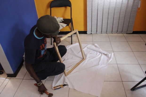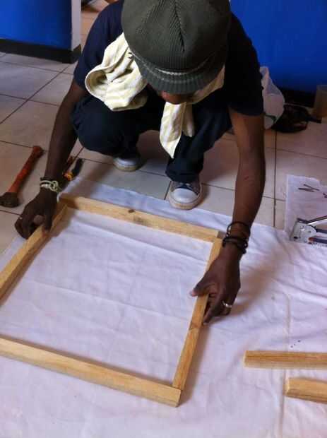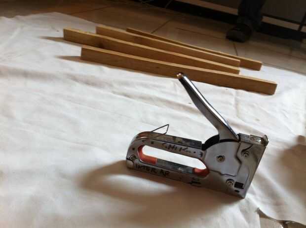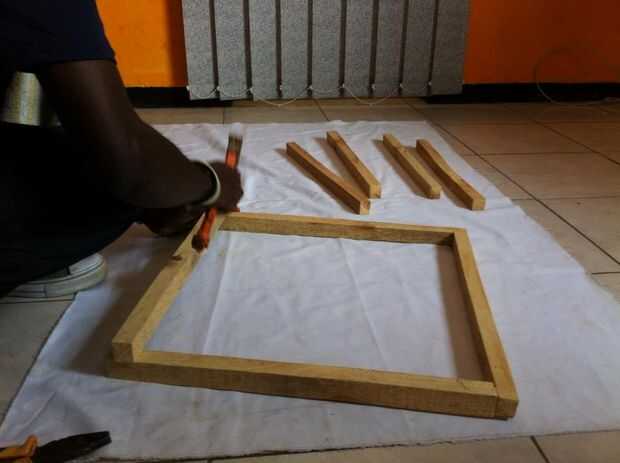 Este paso requiere 4 tiras de madera, una sierra, un martillo y algunos clavos. Una vez que ha decidido sobre el tamaño de la lona que desee crear, usar una sierra para ajustar la longitud de las piezas de madera. Montar las piezas juntos y usar el martillo y clavos para fijar en su lugar.