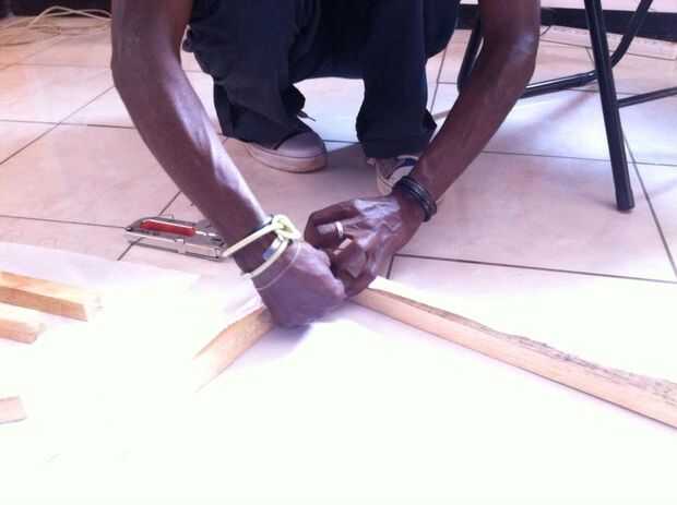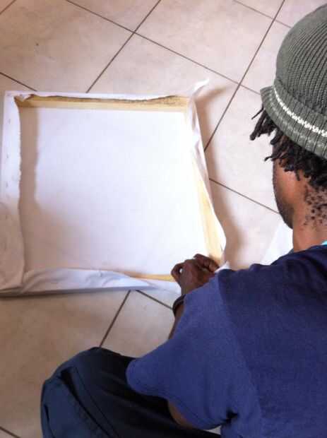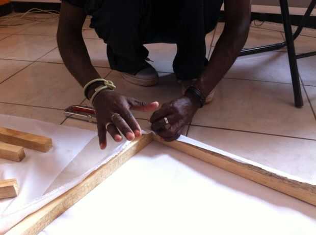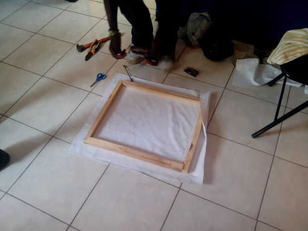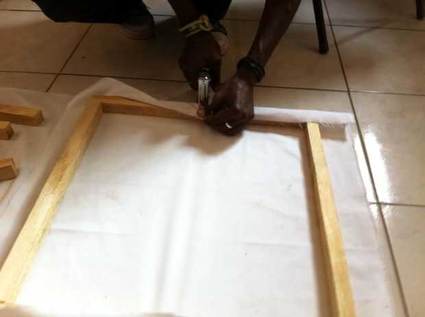 Una vez que la estructura se ensambla puede medir la tela de la lona para caber en el armazón, con tela adicional se superponen en la parte posterior. Coloque a la tela sobre el bastidor y colocar una grapa en el en el centro de la parte superior, en la parte posterior. En la parte inferior, la tela de estiramiento tanto como puede y un elemento básico en el centro de la parte inferior, en la parte posterior del marco. Repita este proceso para los lados. Después de haber colocado cuatro grapas, repita el proceso de tracción y colocación por su lienzo. Para las esquinas puede utilizar un pliegue angular o recto - tire con fuerza, doblar la aleta y grapa al marco.