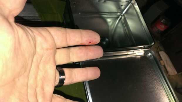 Tratando de tirar de esa última parte del corte un pedazo de metal de la lonchera resultó para ser mal aconsejado. Después de aplicar una ligera presión y dejar que mi perro a lamer la sangre, agarré el hojalatero y quitado el sábalo que cuelga.