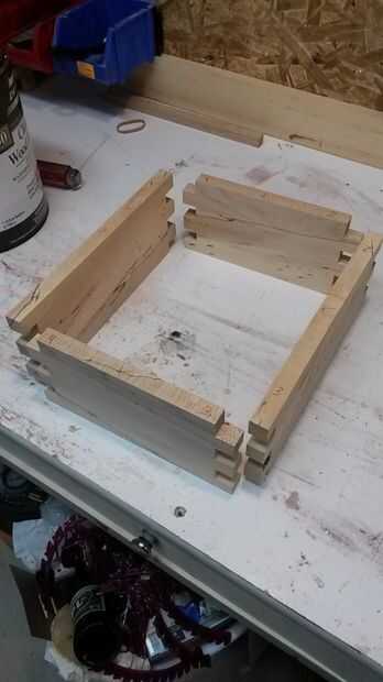 Las articulaciones de la caja para las esquinas fueron cortadas en el Hanon. Hay una plantilla fácil que usted puede hacer para cortar estas juntas. En lugar de reinventar la rueda en este instructable, aquí hay un enlace a algunas direcciones de lugares en la fabricación de la plantilla. Yo se paráfrasis en las fotos anteriores.