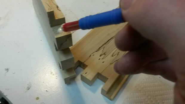 Utilice un pequeño pincel para extender el pegamento sobre las caras de acoplamiento de las articulaciones de la caja. Tuve que raid caja de arte de mi hija para éste.