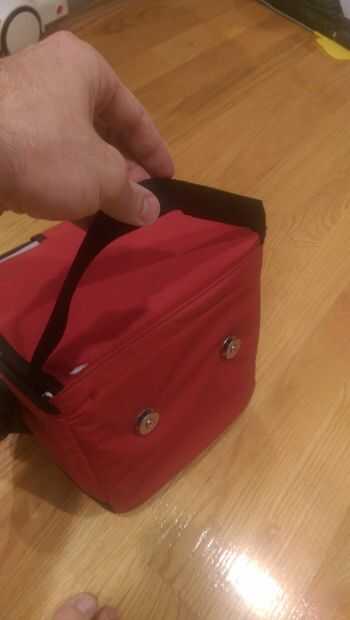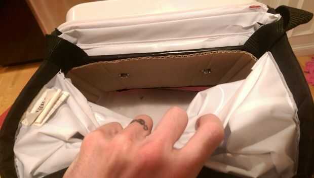 Después de cortar lejos la guarnición interna de la caja de almuerzo, tomé un portapapeles de plástico duro no utilizar más y corta con el tamaño de la parte trasera de mi lonchera. Grabado en los bordes para suavizarlos para no llevar en la lonchera. Con sólo el plástico forro, la bolsa tendida a decaer con el peso, así que corté una pieza de cartón largo suficiente para envolver alrededor de ambos lados y la parte posterior.