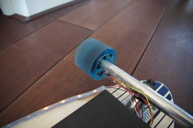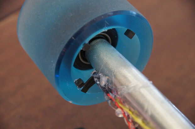 Uno por uno, pegar los imanes en el interior de la rueda. Esto es donde usted necesita los palillos. Deje caer una gota de pegamento en un trozo de madera. Recoger un imán con los palillos, moje en el pegamento y que pulse en la rueda. Encontré que esto era la única forma que podía hacerlo, sin cualquier necesidad de pegan los imanes para metal herramientas o pegado los dedos a la rueda. Asegúrese de que la cara que activa el sensor hall apunta hacia el centro del tablero. Hotglue el sensor hall en el tronco de la longboard, así que hay menos de un milímetro de espacio entre los imanes y el sensor cuando pasa. Revise de nuevo si el sensor hall detecta los imanes mirando el monitor serial y lentamente gire la rueda.
