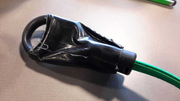 Poner cinta en los ganchos del bungee para cerrar la brecha. Si usted puede encontrar un amortiguador auxiliar con un círculo completo en lugar de un gancho que funciona incluso mejor.
