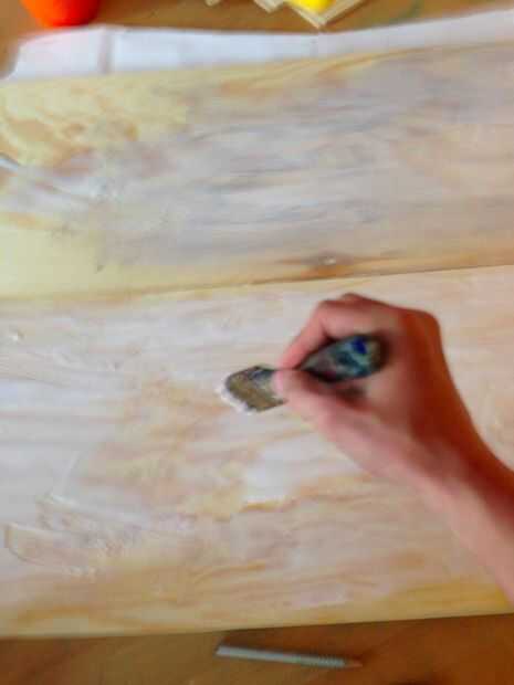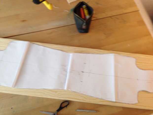 Str con la toma de uno de los bosques y el bosquejo de la Junta a la madera a partir de ahí. Use cinta para fijar a la Junta para que siempre que no se mueva. Tomar las dos piezas de madera y poner el lado bueno en la parte inferior. Luego poner la madera de una línea de pegamento para madera y separar muy bien y bastante a ambos lados. Asegúrese de poner periódico debajo el pegado por lo que no tendrás que limpiar mucho el final. Asegúrese de no poner a mucho pegamento a la madera, como si no saldrá en los lados al poner los dos pedazos juntos. Trate de llegar incluso a la madera y estar muy seguro de que también hay pegamento en los bordes. Luego juntar las dos maderas y tratar de que perfectamente encima de la otra.
