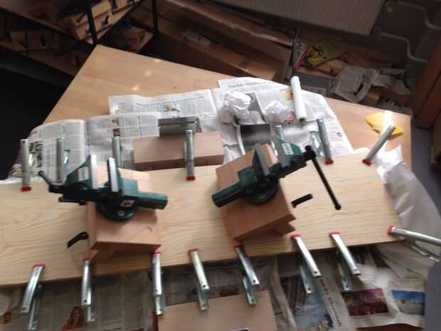 Después de terminar el paso pegamento tome las abrazaderas y poner todo el tablero. Asegúrese de que las esquinas tengan abrazaderas y que los bosques no se mueven durante el proceso o de lo contrario el pegamento podría ir todo y habrás también empezaron a secar un poco.