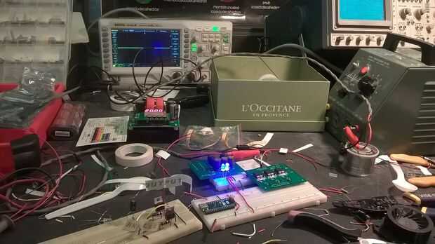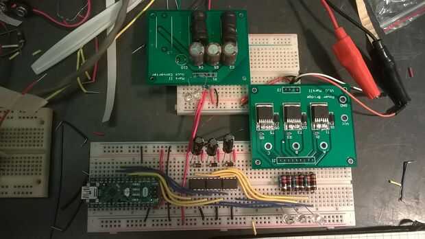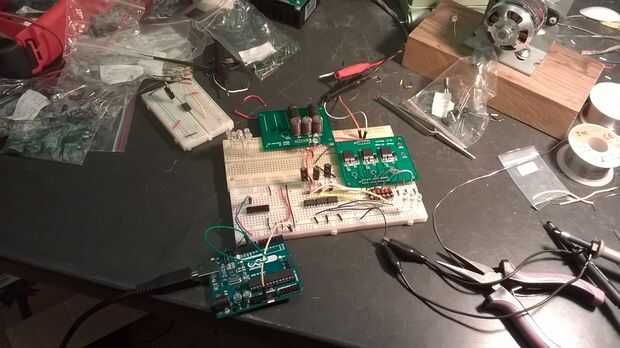 Después de probar los controladores de puerta (NCP5181PG) usando algunos fets aleatoria colocación alrededor y CD se ponga en cortocircuito y luego reparar el convertidor buck varias veces, hice un circuito para probar el puente de la 3 fase. Solía el arduino nano para enviar una señal de pwm de 20khz (usando la biblioteca de PWM1 ) un inversor (con eficacia cambiando la fase 180 grados). Usé la señal invertida y no invertidas para el controlador de puerta de control. Sin embargo el problema me topé fue que me metía de 4ns de superposición y ya que este controlador de puerta no tenía ningún brote a través de la protección abría dos Mosfets al mismo tiempo para 4ns. Me imagino que no era muy saludable para ellos... Aunque estoy seguro que están bien porque están clasificados para los pulsos 1500amp en < 10ns. Sin embargo se trata de presión adicional en el sistema y una pérdida de potencia innecesarios así que ordené un inversor más rápido y controladores de puerta con protección a través de disparar.