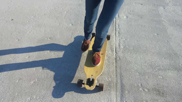 c. Coloque el pie derecho en la parte posterior del tablero, paralelo con el eje de las ruedas