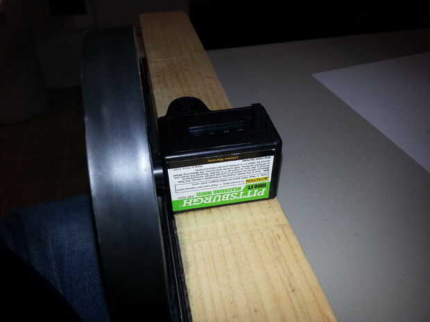 Una vez que el mango se ha ido, de epoxy la caja del contador para la pieza de madera. Asegúrese de que los números están apuntando hacia arriba para que usted puede leerlos. La caja debe ir a la derecha en el centro. Mantenga la rueda justo lo suficientemente lejos de la madera para evitar raspar.